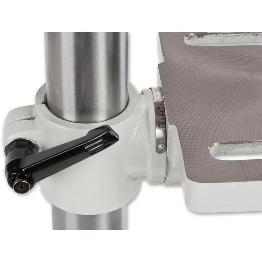 Powered by a 350W induction motor, there is a choice of 5-belt speeds between 600 and 2,500rpm, covering a good range of hole sizes and materials. The down feed is fitted with soft grip handles and there is a convenient drilling depth control. Table height is adjusted by sliding the table assembly up or down the column. For taller work the table can be swivelled away to allow the base to be used as a work support. A front mounted NVR switch and the adjustable chuck guard add to the convenience of use. The belt cover has a safety switch to ensure safe speed changing. This small drill is a very useful machine to have in a small home workshop, versatile and reliable.