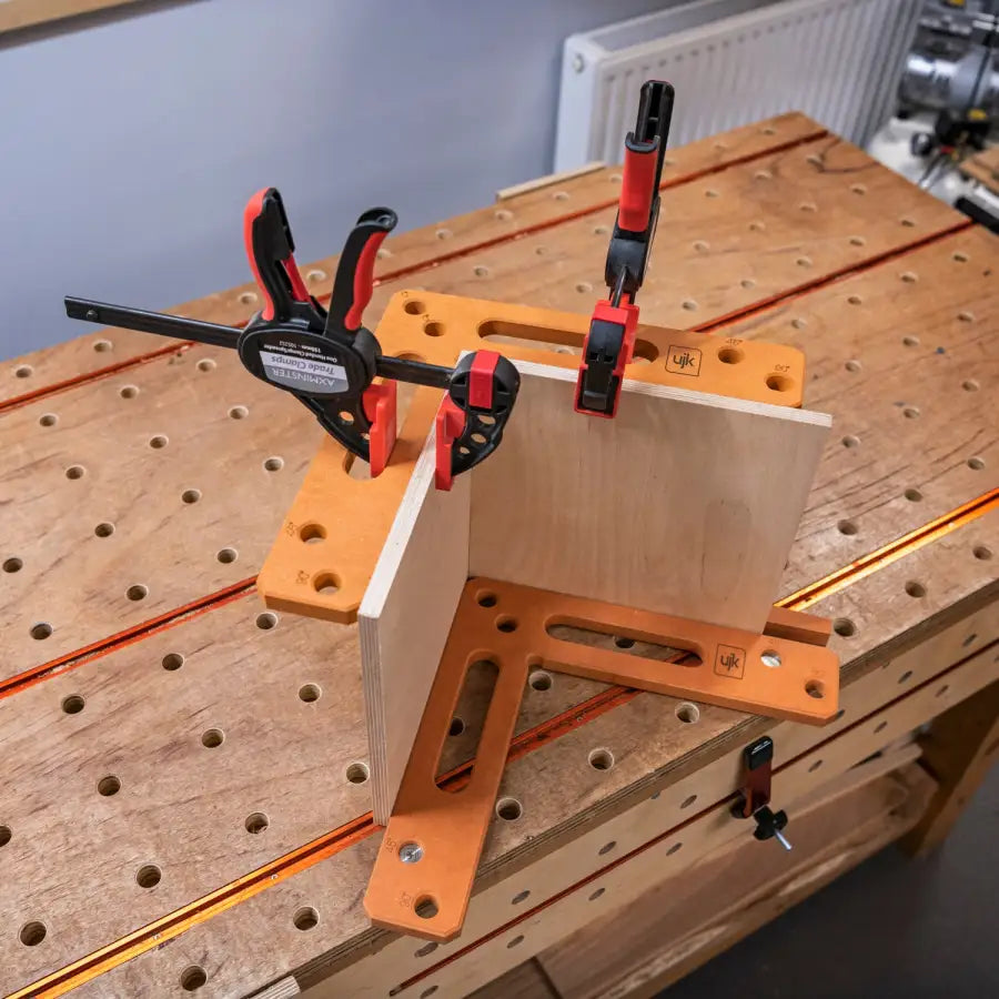 Upgrade your woodworking precision with the UJK Assembly Square. CNC-machined from HDF Valchromat, this L-shaped accessory can be used alongside a multifunction table and dog holes for spot-on 45° mitre cuts. This makes it a useful accessory for gluing, fixing, and assembling cabinets, frames, and carcasses. The legs are at 90°, and feature 3 x 20mm dog holes. British made.